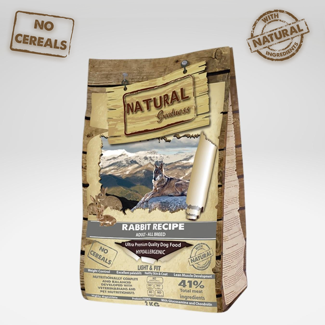 Croquettes Natural Greatness pour chiens. Recette hypoallergénique à base d'une seule protéine (viande de lapin), faible en matières grasses, pour chiens adultes de toutes races.
