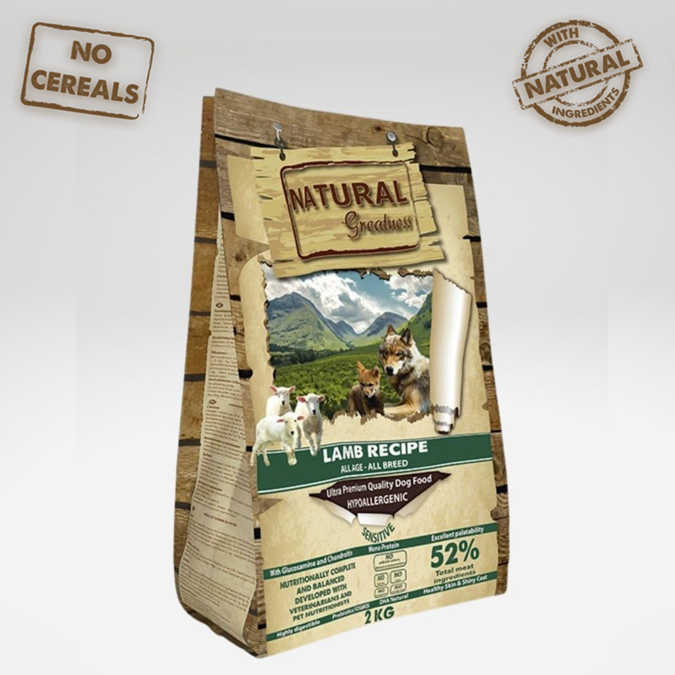Croquettes Natural Greatness pour chiens. Recette hypoallergénique à base d'agneau monoprotéine, adaptée aux chiens de tous âges et de toutes races.