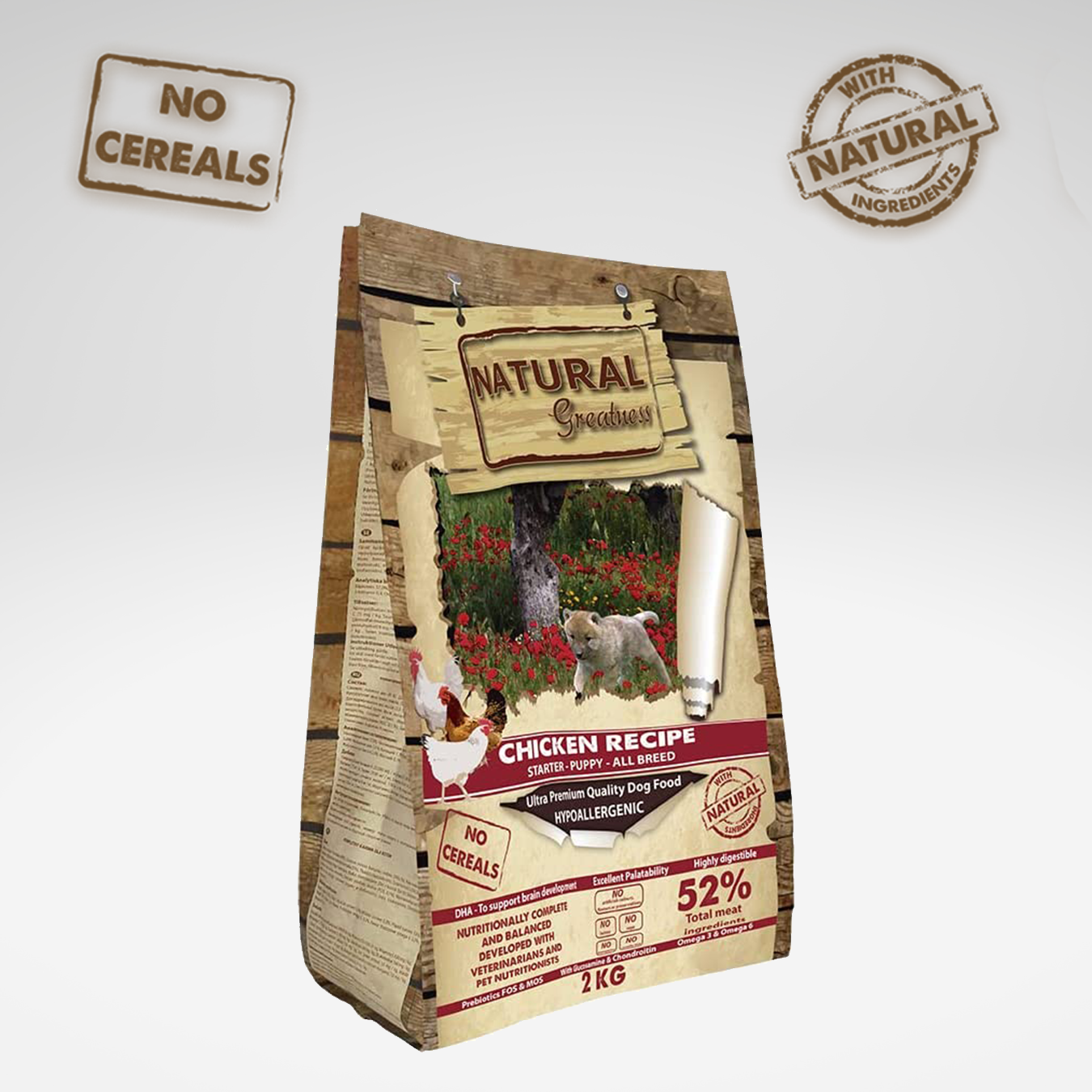 Croquettes Natural Greatness pour chiens. Recette hypoallergénique au poulet pour chiots du sevrage à 12-18 mois, excellente pour les femelles gestantes ou allaitantes et les chiens adultes de petite taille.