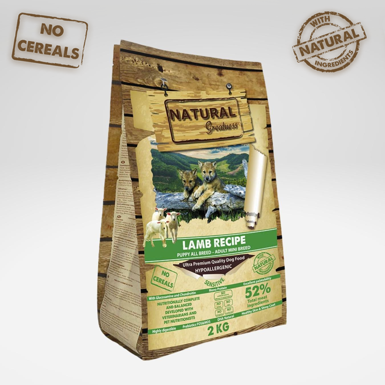 Croquettes Natural Greatness pour chiens. Recette hypoallergénique à base d'agneau (protéine unique) pour chiens adultes de petite taille, chiots de tous âges dès le sevrage, chiens très actifs et femelles gestantes ou allaitantes. Particulièrement adaptées aux chiens à digestion sensible.